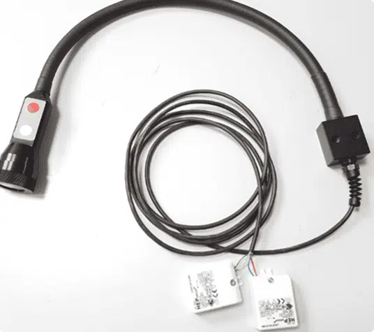 L’un des principaux sous-ensembles de la lampe est son flexible métallique semi-rigide, qui assure à la fois le support mécanique de la tête d’éclairage et une liberté de positionnement. Fabriqué en laiton monté sur ressort inox, ou bien combinant deux éléments de flexibles semi-rigides mettant en œuvre des couples matières différents pour proposer une très bonne facilité d’orientation spatiale de la Tête de lampe et une très bonne capacité de maintien dans les cas de supports flexibles de longueur importante, les supports flexibles sont recouverts d’une gaine thermo rétractable noire suivant plusieurs options parmi lesquelles les gaines auto-extinguible, conforme à la norme UL-224 VW-1.